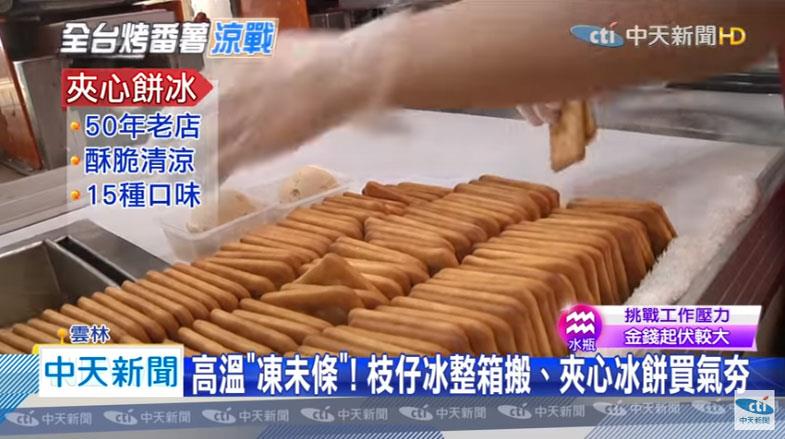 夏天酷熱,吃冰消暑最受歡迎,雲林斗六當地傳統夾心冰餅,已經有50年歷史,口感酥脆清涼口味多樣,生意超好,一天可賣上千個。(畫面取材自中天新聞報導)
